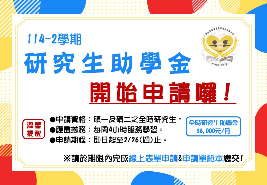 114-2學期研究生助學金(6,000元/月)開始申請囉!